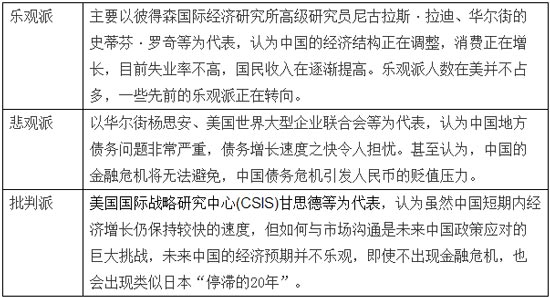 美精英界对中国经济新常态三种分析/孙志制表(图表来源《美国的焦虑:一位智库对美国的调研手记》,人民出版社)