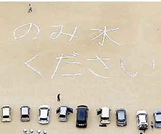 图:江南中学的灾民在操场划出“请给我饮用水”的字样/法新社