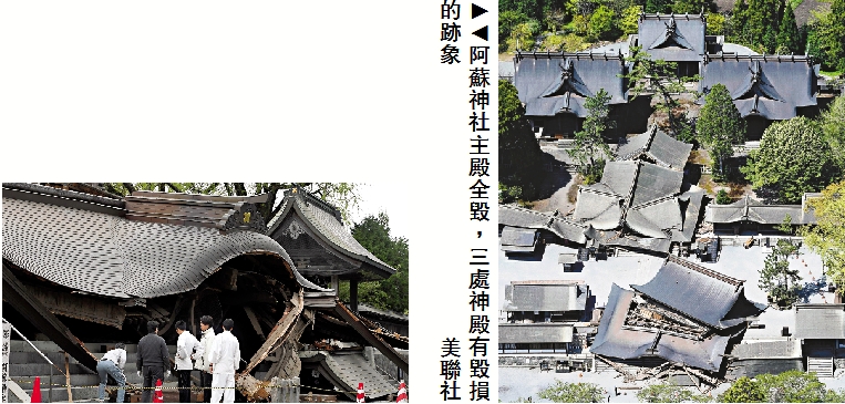 阿苏神社位于阿苏山的北侧、熊本县阿苏市。据报道,被指定为国家级重要文物的“楼门”崩塌。神社内另一国家级重要文物“一之神殿”也有部分受损。神社的参拜主殿全毁,三处神殿有毁损迹象,有当地民众赶至神社看到眼前灾情,不禁哽咽说:“怎么办?”