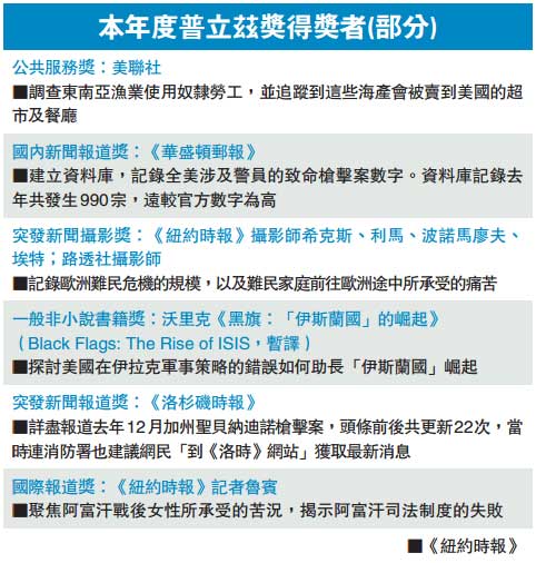 大公网4月20日讯 美国新闻业年度盛事、第100届普立兹奖前日揭盅。美联社去年发表一系列调查报道,揭露东南亚渔业奴役渔工,最终让2,000多名工人获救,并促使东南亚渔业全面改革,因此获得最具分量的公共服务奖。《纽约时报》及路透社则因为拍摄中东难民登陆欧洲的照片,共同分享最佳突发新闻摄影奖。