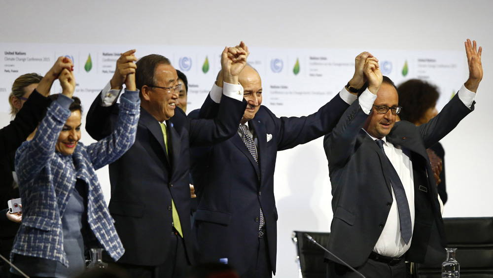 图:去年12月12日,法国总统奥朗德(右一)和联合国秘书长潘基文(左二)庆祝达成巴黎气候协定\美联社