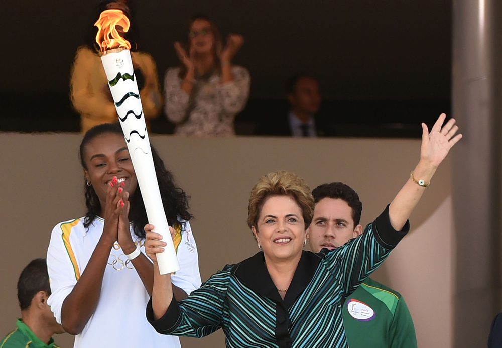 图:巴西总统罗塞夫3日在首都巴西利亚迎接传递到总统府的奥运圣火\法新社