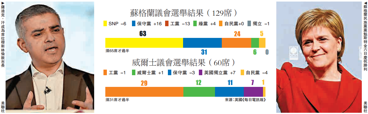 大公网5月7日讯(驻伦敦记者李威)英国“超级星期四”选举落幕,可谓几家欢乐几家愁。根据已公布的点票结果,执政的保守党在苏格兰地方选举中表现出色,跃升第二大党,而在野的工党遭受惨败,沦为第三大党,但在英格兰地方选举中仍保持了优势,该党候选人萨迪克.汗成为首位穆斯林伦敦市长。主张脱欧的英国独立党成为最大赢家,在威尔士地方选举中破天荒地拿下六个议席。