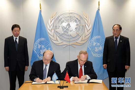 5月6日,在纽约联合国总部,中国常驻联合国代表刘结一(前左)与联合国秘书长办公室主任、副秘书长穆莱特(前右)签署设立中国-联合国和平与发展基金协议。新华社记者摄