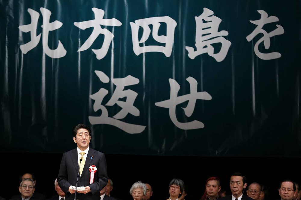 图:去年2月,日本首相安倍晋三出席东京举行的“北方四岛”返回问题会议/路透社