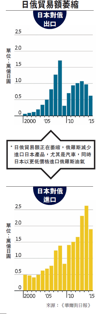 日本主要希望与俄罗斯加大经贸合作,藉此影响有关争议岛屿的谈判。东京也认为,日本资源匮乏,普京加重对资源丰富的远东和西伯利亚投资的“向东看”政策,符合日本的利益。俄罗斯正邀请日本公司前往东西伯利亚投资石油和天然气田,俄罗斯的“库页岛2号”项目,就有日本三井物产和三菱集团参与合作。