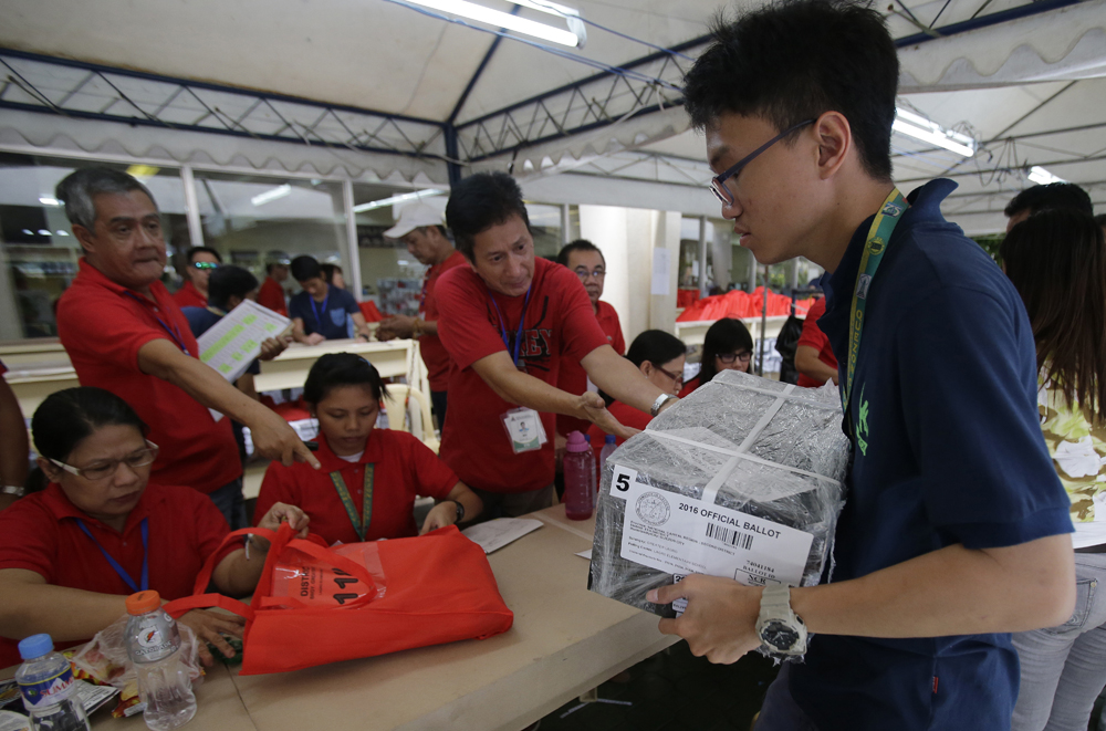 图:马尼拉票站工作人员8日紧张准备大选\美联社