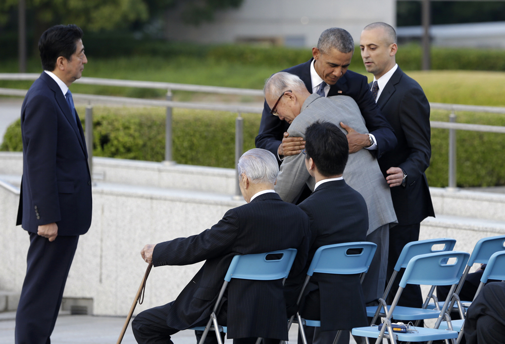 图:奥巴马(中)拥抱日本原爆幸存者 美联社
