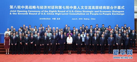 6月6日,第八轮中美战略与经济对话和第七轮中美人文交流高层磋商联合开幕式在北京钓鱼台国宾馆举行。这是开幕式后,与会人士合影/新华社