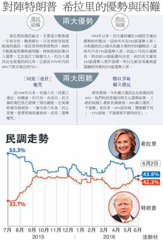 大公网6月8日讯 综合美联社、《纽约时报》、《华盛顿邮报》报道:2016年美国总统大选民主党参选人、前国务卿希拉里迄今已获得2383张代表票,锁定本党提名,代表民主党角逐白宫一事基本成为定局。由于特朗普上月底已经锁定共和党总统候选人提名,希拉里对阵特朗普的白宫大战已经开打,希拉里以自己擅长的外交政策,抨击特朗普的主张不顾国家安全,对特朗普发动到目前为止最为猛烈的攻击。