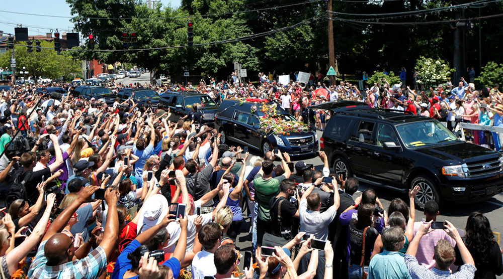 与克林顿一起,阿里的家人以及近一万五千名来自世界各地的追思者聚集在当地一座篮球馆内,分享怀念阿里带给他们的故事和感动。