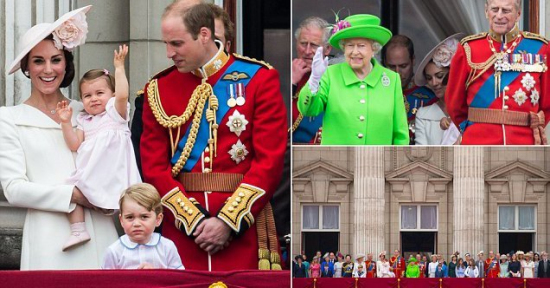 阅兵结束后女王按惯例与其他王室成员一道出现在在白金汉宫阳台上,包括王储查尔斯王子夫妇、威廉王子一家四口以及哈里王子等,共同观看皇家空军飞行表演。