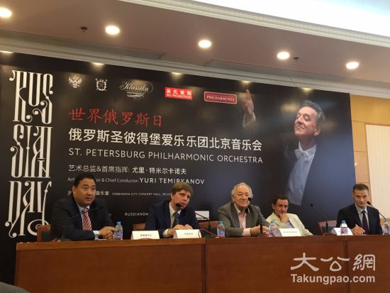 俄罗斯圣彼得堡爱乐乐团在首席指挥家尤里•特米卡诺夫(左三)发布会答记者问 大公报记者 严雪/摄