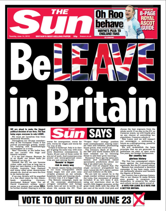 大公网6月14日讯 (驻伦敦记者 李威) 距离英国脱欧公投只剩一个多星期前夕,英国最畅销小报《太阳报》在14日头版公开呼吁民众支持脱欧,多项最新民调显示脱欧阵营保持领先,预测度准确率更高的博彩公司也大幅降低脱欧的赔率,种种迹象表明英国脱欧的风险正急速上升。欧洲理事会主席图斯克警告,英国如果脱欧,将是欧盟和乃至整个西方政治文明解体的开始。