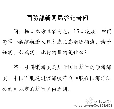 据国防部网站6月15日消息称,日本防卫省消息,15日凌晨,中国海军舰艇进入日本鹿儿岛附近领海,国防部回应。
