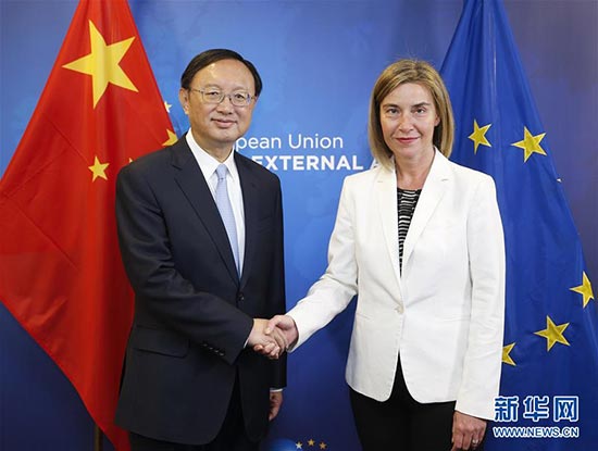 6月10日,中国国务委员杨洁篪(左)同欧盟外交与安全政策高级代表莫盖里尼在比利时布鲁塞尔欧盟总部举行第六轮中欧高级别战略对话/新华社