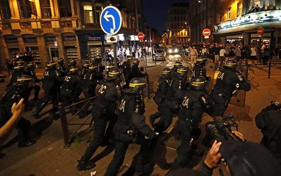 图:配有防爆装备的法国警察在里尔街头驱赶球迷\美联社