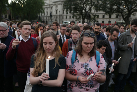 民众在伦敦议会大楼前点蜡烛纪念考克斯。法新社