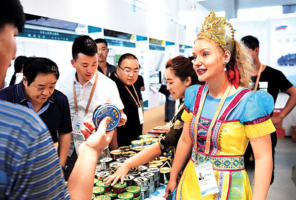 16日,哈尔滨国际经济贸易洽谈会聚集了“一带一路”沿线国家和地区的众多参展商。图为与会者在俄罗斯展位咨询\新华社