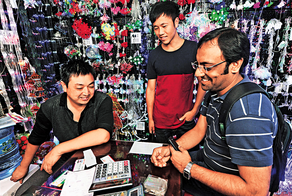 印度客商(右)在浙江义乌国际商贸城采购商品\资料图片