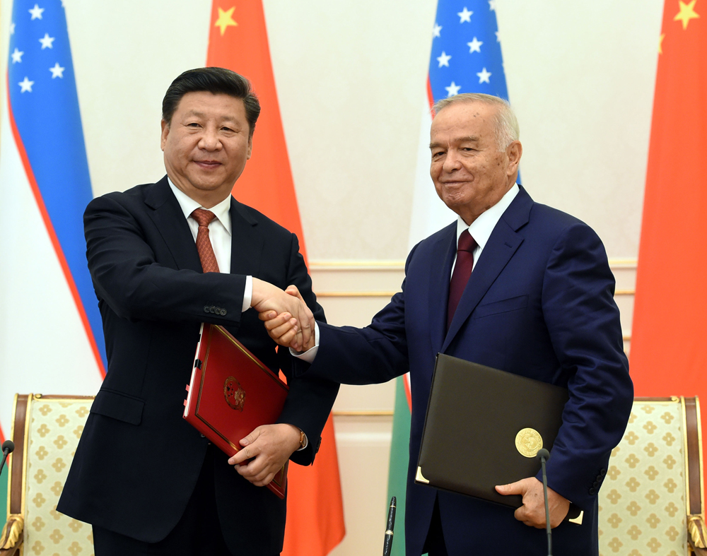 大公网6月23日讯 据新华社、中通社报道:中国国家主席习近平22日在塔什干同乌兹别克斯坦总统卡里莫夫举行会谈。两国元首签署了联合声明,一致决定建立中乌全面战略伙伴关系;双方达多项共识,包括支持共建丝绸之路经济带,在经贸、投资、能源、交通、农业、金融、科技领域深化互利合作,同意共同严厉打击“三股势力”等。两国元首还见证了外交、经贸、融资等领域多项双边合作文件的签署。