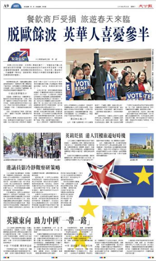 大公网6月25日讯(记者许嘉信、李淇)英国公投决定脱欧,在英华人华侨反应不一,有餐饮商户担心英镑贬值生意受到影响,但也有旅游业者认为可能招来更多游客。中资企业态度相对谨慎,对英国经济前景保持信心,相信中英“黄金时代”仍会继续。专家指,脱欧对华人华侨及中英关系的影响好坏参半,仍需要时间来观察。