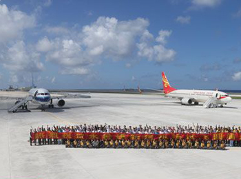 中国两架民航客机降落南沙永暑礁新建机场。图为相关人员合影留念。