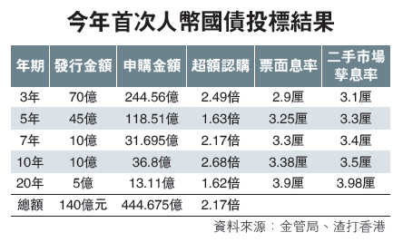 中银香港(02388)高级经济研究员应坚表示,3年期国债的中标利率只为2.9厘,大大低于财政部6月份在英国伦敦发行同年期国债的3.28厘,反映市场对人民币资产需求十分旺盛。此外,各年期国债平均超额认购近2.17倍,为最近两年来较高水平。