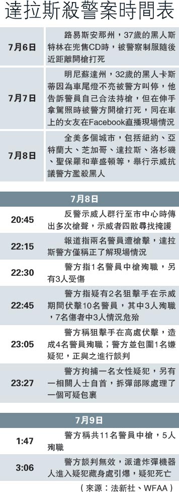7月6日及7月7日,美国路易斯安那州和明尼苏达州分别发生警察杀死黑人案件,过程均被拍下发布在社交媒体,引起群情激愤。7月8日,全美各地包括纽约、亚特兰大、芝加哥、达拉斯、洛杉矶、圣保罗和华盛顿等,都有示威抗议警员滥杀黑人,但在达拉斯的示威现场,则演变成一起震惊全美的恐怖案件。