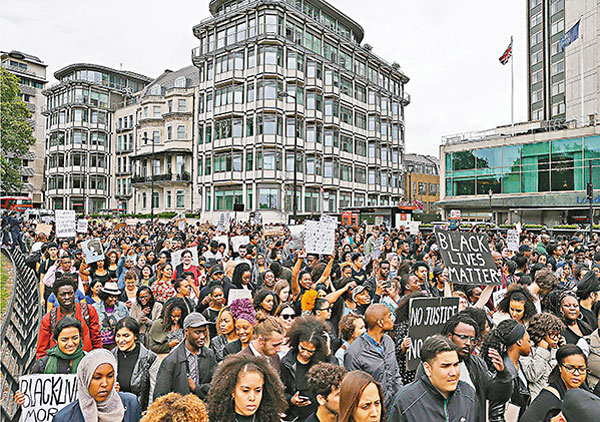 英国伦敦昨日有数百人上街示威,声援美国黑人,他们手持写有“停止杀害我们(黑人)”等标语。