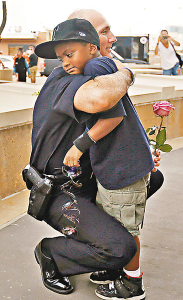一名黑人小童向白人警察献花。路透社