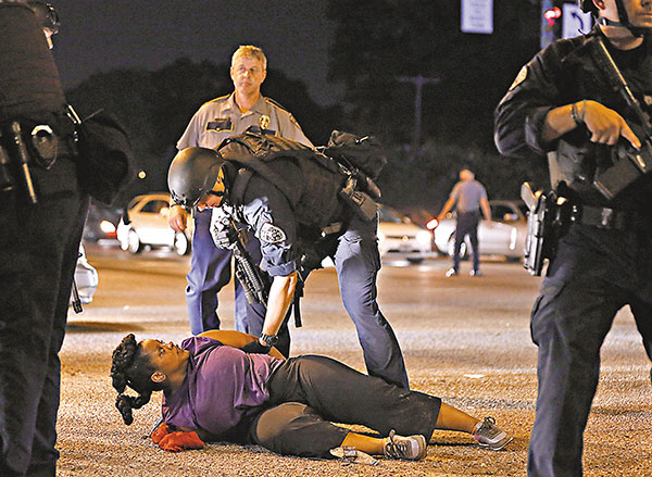 在37岁黑人男子斯特林被杀的路易斯安那州首府巴吞鲁日市,黑人组织“黑豹党”成员与防暴警察爆发冲突,警方拘捕约30人,并检获大批武器。田纳西、印第安纳和加州等地亦爆发示威。纽约的示威者冒雨游行,有参加者称“看到黑人尸体不断堆积,感到愤怒”,高呼“不要种族歧视的警察”。