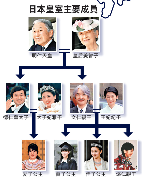 报道指,明仁的继承人是56岁皇太子德仁,但德仁只有一个独女佳子,而目前规定只有男性可以继承皇位,德仁之后会传给侄子悠仁亲王,悠仁目前年仅9岁。