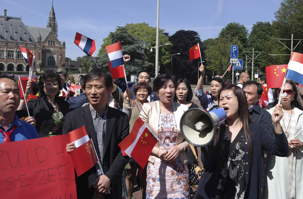图:7月15日,荷兰华人华侨前往海牙和平宫前广场,抗议南海仲裁案仲裁庭裁决 中新社