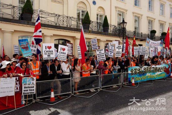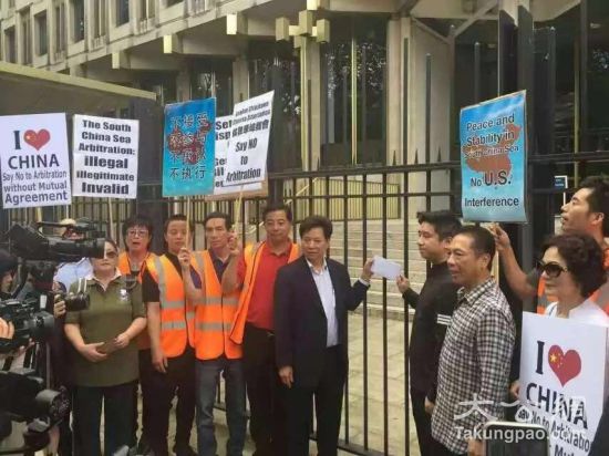 大公网7月17日讯(驻伦敦记者李威)来自英国各地的华人华侨16日在伦敦举行大规模示威游行,抗议菲律宾南海仲裁案仲裁庭的非法、无效裁决,支持中国政府不接受、不承认的立场,并向菲律宾和美国驻英国使馆递交抗议信。