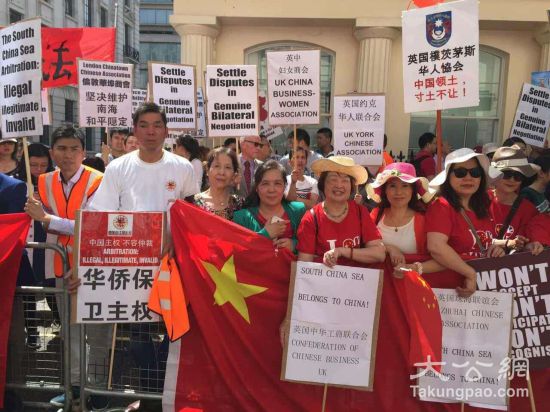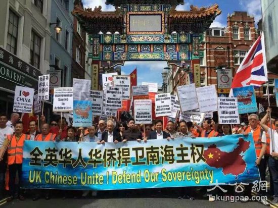 当天下午2时,来自全英数百华人社团的上千名华人华侨在伦敦唐人街集结,他们打出“越权管理、违法仲裁”、“中国主权、不容仲裁”、“捍卫中国主权”、“南海属于中国”等中英文标语,高喊抗议口号,穿过伦敦市中心,分别来到菲律宾和美国驻英国使馆前抗议并递交抗议信,这也是英国华人华侨近年来声势最为浩大的一次游行。