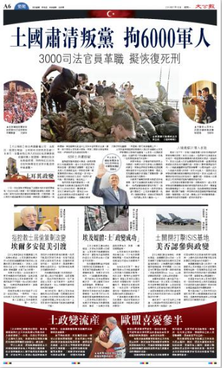 埃及国营媒体《金字塔报》首页的红色标题写着,“土耳其军方推翻埃尔多安”。小标题则写着“埃尔多安正在消失”。《祖国报》则报称,“军方控制土耳其并罢黜埃尔多安”,将土国军方的未遂政变称为“军事抗命”。