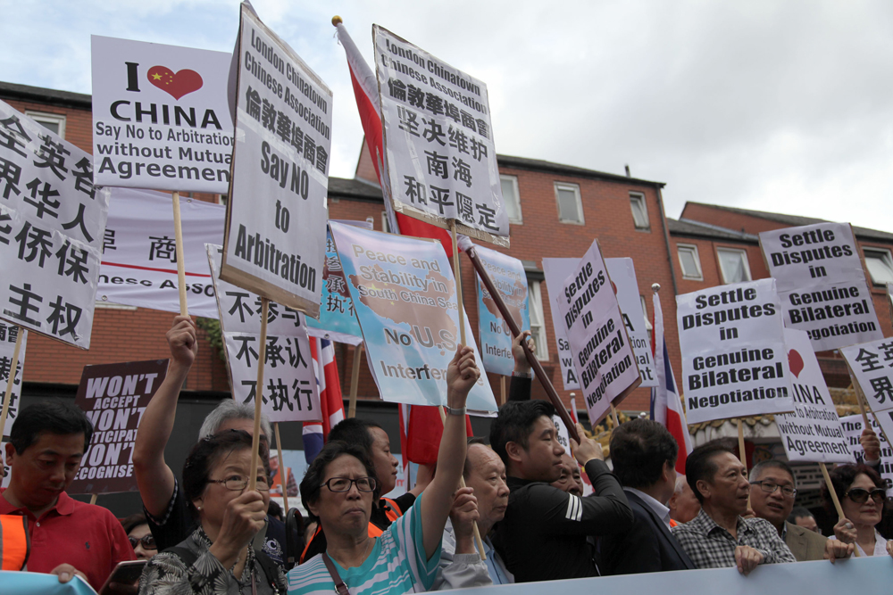 来自英国各地的华人华侨16日在伦敦举行大规模示威游行,抗议菲律宾南海仲裁案仲裁庭的非法、无效裁决,支持中国政府不接受、不承认的立场,并向菲律宾和美国驻英国使馆递交抗议信。