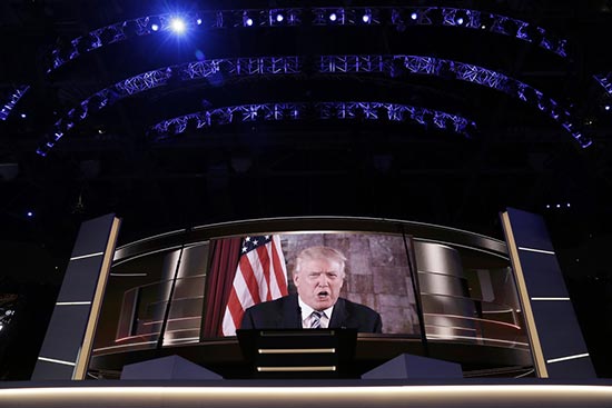 图:共和党全国代表大会次日,特朗普突然从大屏幕出现/美联社