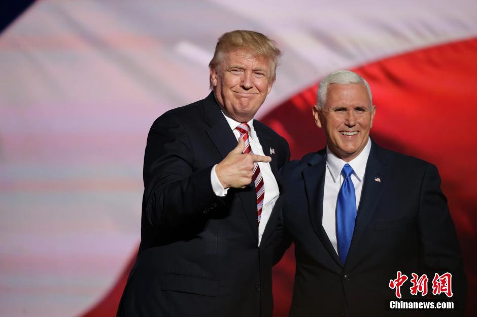 当地时间7月20日,美国俄亥俄州克利夫兰,特朗普和彭斯同台亮相共和党全国代表大会。19日,经过各地代表轮流唱票表决,大会正式提名唐纳德·特朗普和迈克·彭斯为共和党正副总统候选人。 中新社记者 廖攀 摄