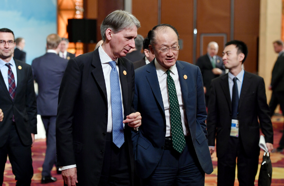 图:24日,G20财长和央行行长会议期间,英国财政大臣哈蒙德(前左)与世界银行行长金墉交流新华社