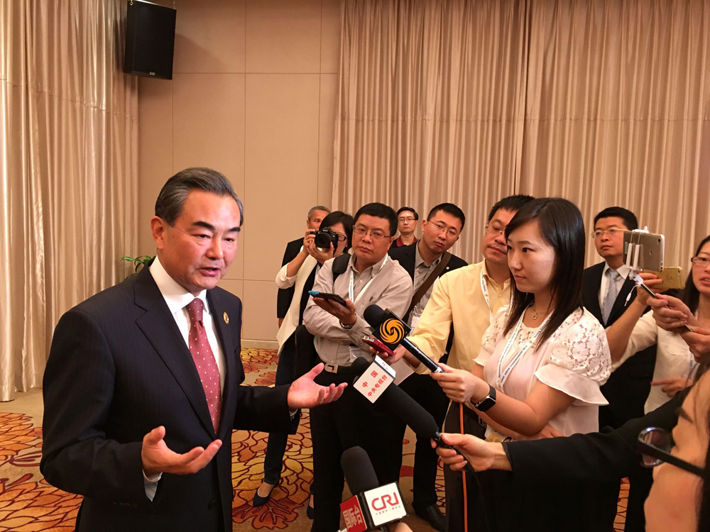 图:7月26日晚,王毅向中方媒体介绍系列外长会有关情况和成果 中新社