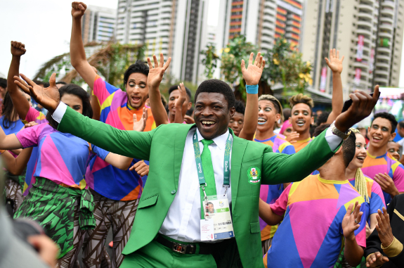 图:尼日利亚摔跤运动员3日在奥运村表演\法新社