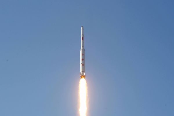 图说:2016年2月7日,朝中社提供的照片显示,朝鲜当天利用运载火箭成功发射“光明星4号”地球观测卫星。新华社/朝中社