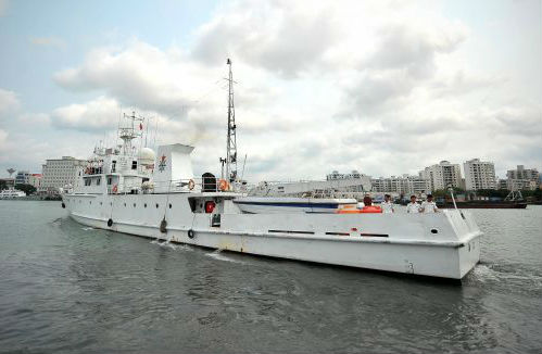 资料图片:中国渔政船赴西沙及黄岩岛海域巡航护渔。2013年3月26日,中国渔政46012船驶离海口市新港码头。(新华社发)