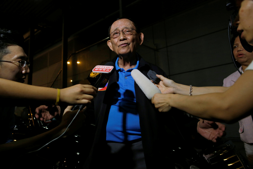 图:菲律宾总统特使兼前总统拉莫斯8日晚抵达香港机场并接受采访\路透社