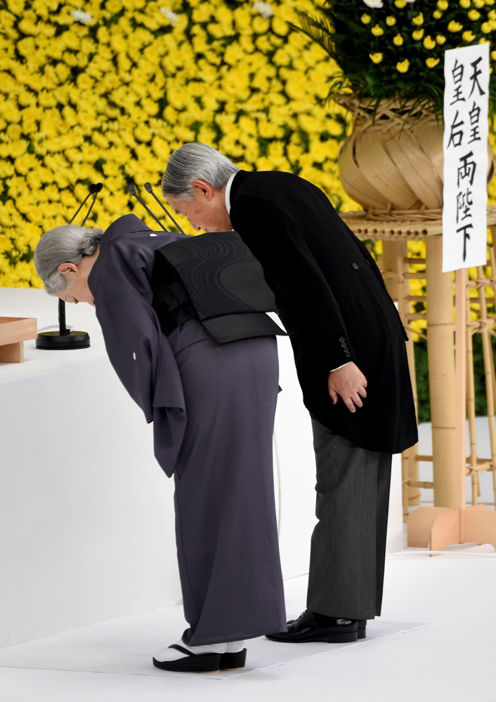 图:日本天皇明仁(左)及皇后15日在“全国战殁者追悼仪式”上鞠躬/法新社