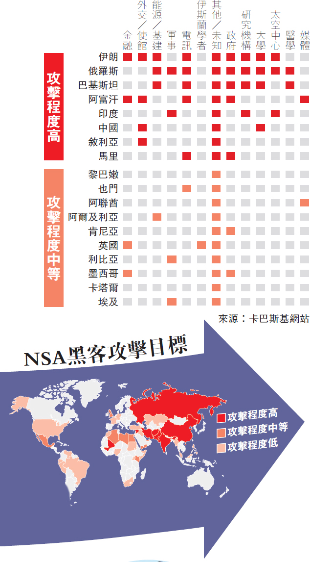 去年年底,俄罗斯电脑安保公司卡巴斯基实验室率先在报告中披露,黑客组织“方程式组织”(Equation Group)14年来在全球秘密从事黑客任务,针对俄罗斯、中国和伊朗等国的政府、电信公司和其他组织发动黑客攻击。卡巴斯基在报告中未提到任何美国机构名称,但网络保安专家相信,“方程式组织”是美国国家安全局的一个精英黑客分支。