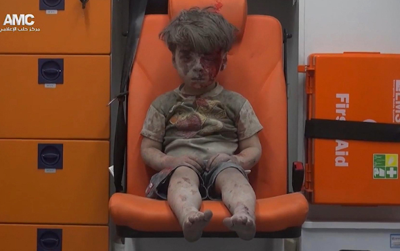 叙利亚反对派组织“阿勒颇媒体中心”17日发放了一段令人难忘的视频,显示了一名男童在重镇阿勒颇一次毁灭性空袭后获救的情形。片中见到搜救人员把一名男童从瓦砾堆中拉出,放到一辆救护车的后座。坐在橙色椅子上的男童因受尽惊吓显得眼神呆滞,双脚赤裸,全身布满厚厚的尘土,好像没意识到鲜血正从前额汩汩流出。画面所见,男童满脸惘然,也没有哭,坐定后抬起手碰了碰受伤的地方,然后用左手擦擦脸,再看着自己的双手,又在救护车的椅子上擦手。