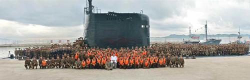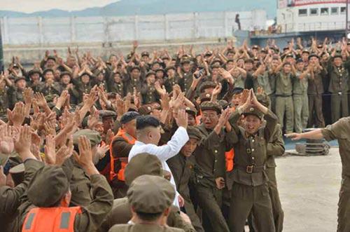 发射成功后,金正恩到港口亲切迎接返航的国防科技人员和海军官兵,热烈祝贺试验取得成功,并同他们合影留念。